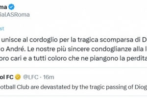 罗马官推写道:“罗马俱乐部对若塔及其兄弟安德烈的不幸离世表示哀悼。我们向他们的家人、亲友以及所有为他们哀悼的人致以最深切的慰问。”